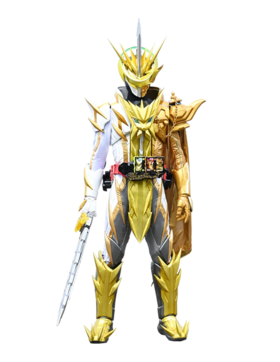 使用「圣刃 剑驱动器()」,在左侧插槽插入「地狱三头犬奇幻骑士书()」,中间插槽插入「尖针刺猬奇幻骑士书()」,右侧插槽插入「阿拉丁神灯奇幻骑士书()」进行变身的派生奇幻联组超强化形态。