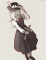 一个穿着好像洋装一般的衣服的带着帽子手持十字状物体的少女,由于整个画面是单一色调的,因此无法看清服装配色。