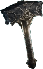 据说此锤的头是坚硬的岩石或是铁所打造而成,握柄部份则是以世界之树的木材作成。此武器的功能为可以击穿任何东西,要是把它扔出去,它会毫无误差地击中目标,而且飞出去之后还会自动飞回持有者的手中。