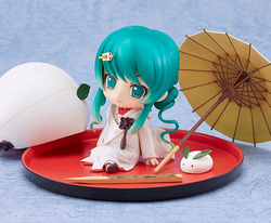 有两款发型,标准的雪未来双马尾和团子发型,帽子可以拆卸,有坐和站两种身形,微笑、浅笑、幸福哭泣三种表情,可拆卸的发带,兔子大福一只,雪花油纸伞一个,竹签一个,果子托盘一个