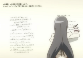 第3集第8集中,织崎纱耶帮助主人公复习数学时,亦出现了写满数学解答的作业本。虽然题干并没有在番剧中给出,但可以推断出是一道几何与三角函数结合的大题,符合日本高中难度。